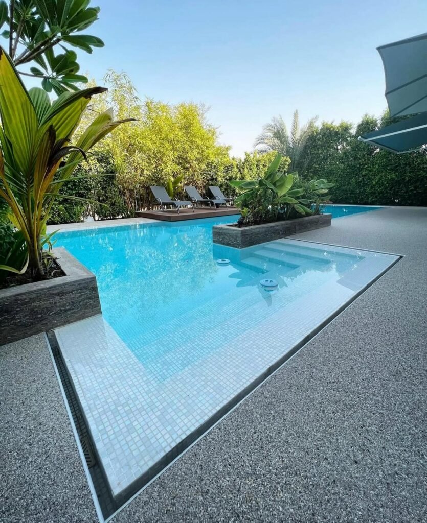 Piscinas integradas en la terraza: donde agua y superficie exterior se funden en un mismo plano.